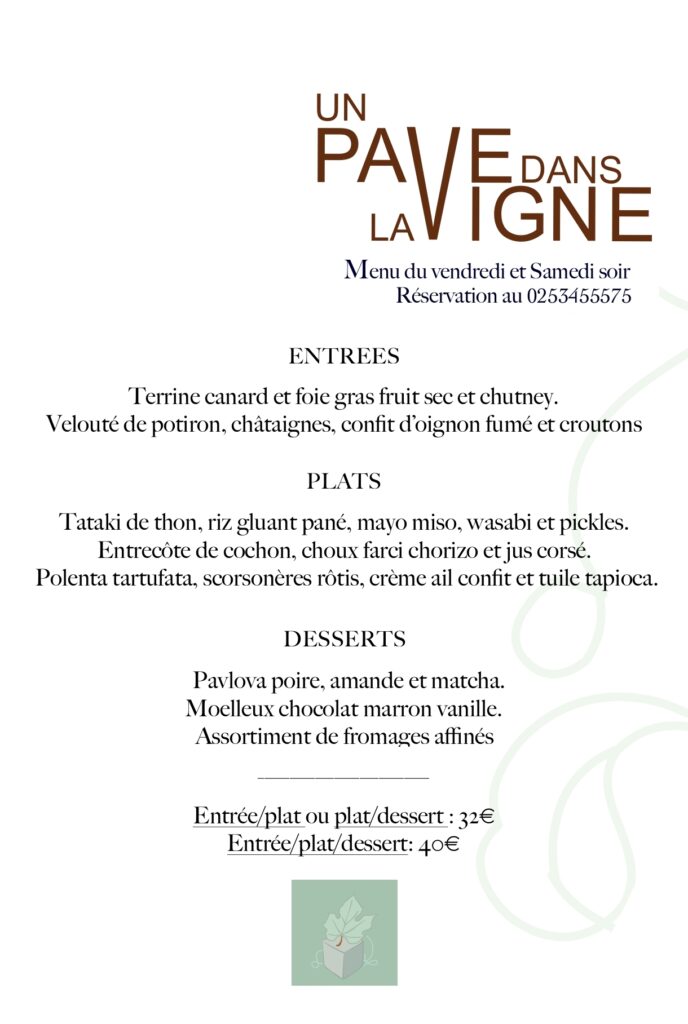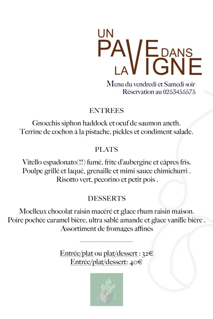 Voici le menu du vendredi soir et samedi soir d’Un Pavé dans la Vigne restaurant cave à vin bistronomique à Nantes.